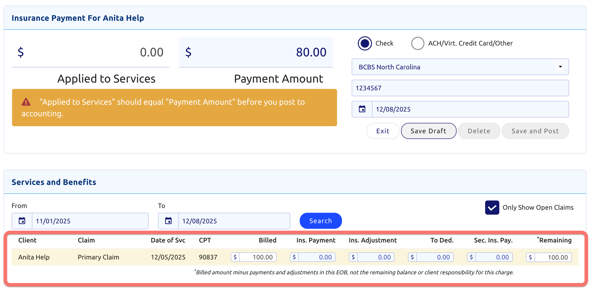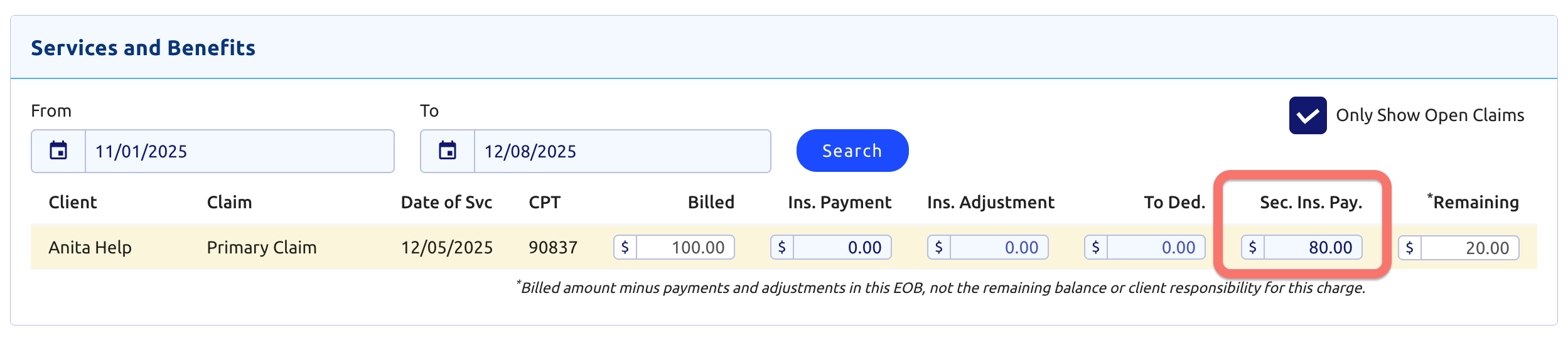 Note: The remaining column (far right) will reflect the amount the client is responsible for, even if it's already been paid.