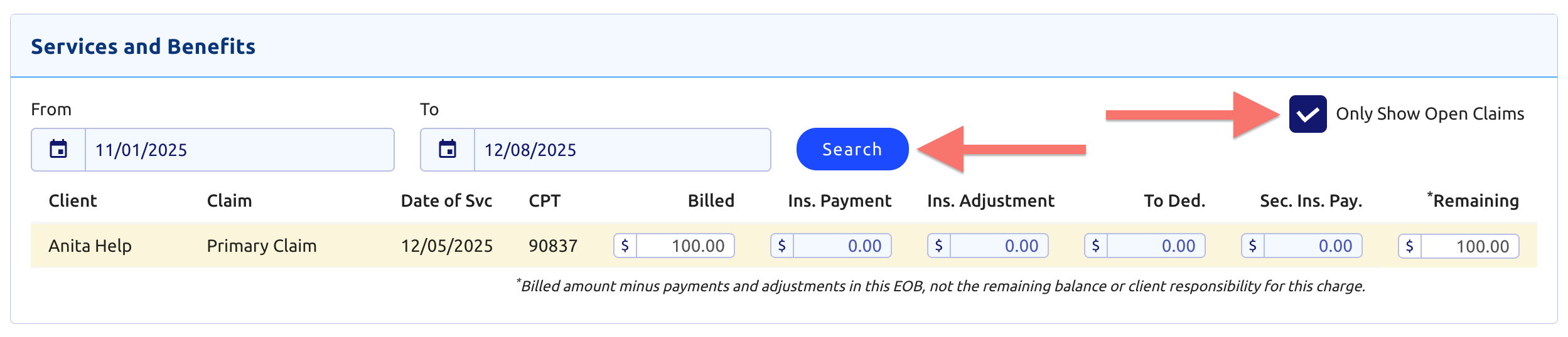- If the Date of Service is still not visible, uncheck the option Only Show Open Claims to the right: