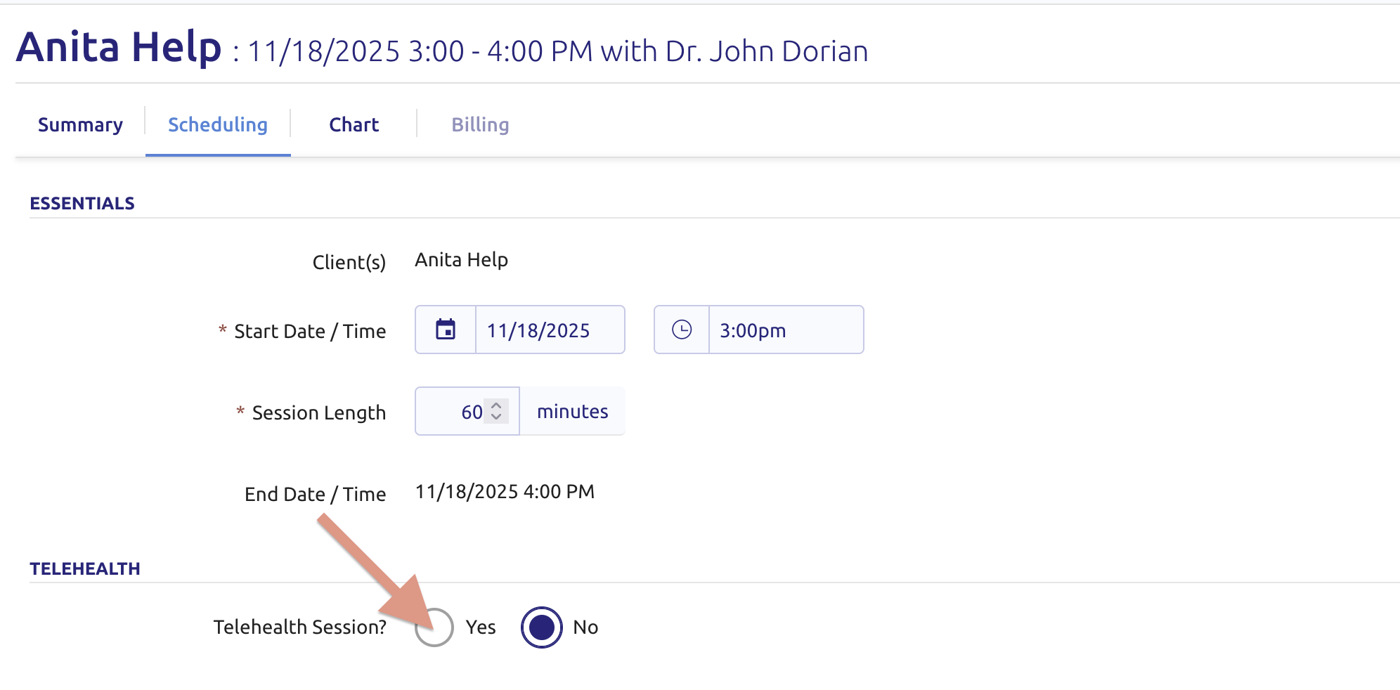 If you have an existing standard appointment on your schedule and would like to change it to a Telehealth session, perform the following steps: