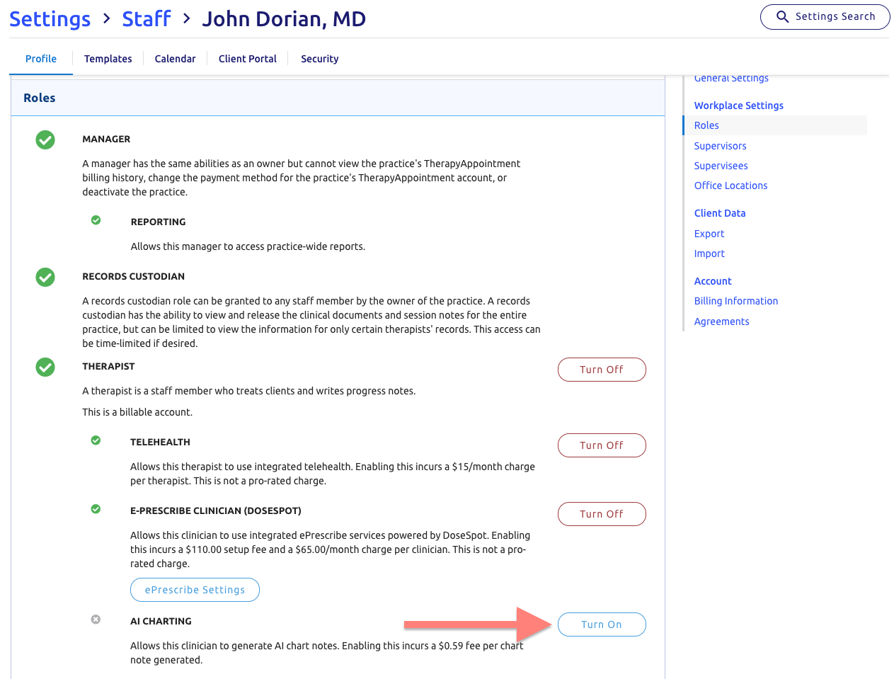 - Under the Therapist role find the AI Charting sub role and click shown below: