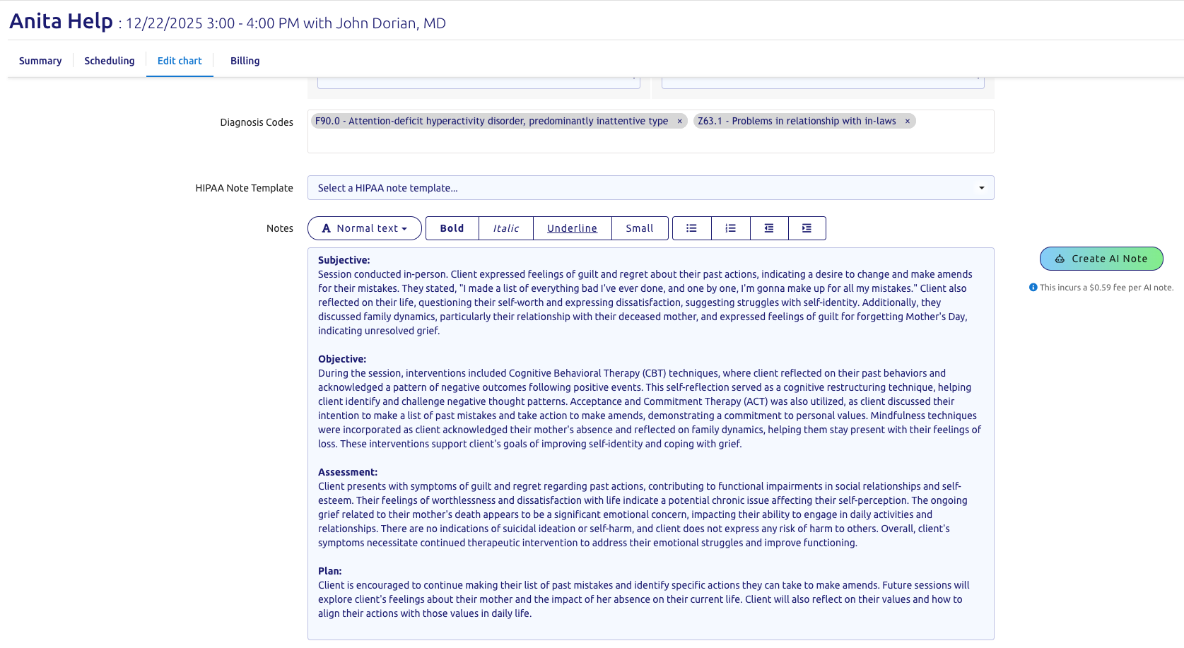 After recording and ending a session, the AI will automatically generate a chart note draft for you. It allows you to: