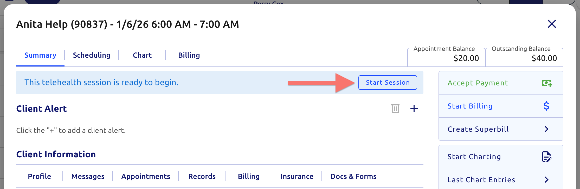 Lastly, we just need to bring up the chart note and begin the AI chart note recording. Once you join the telehealth session: