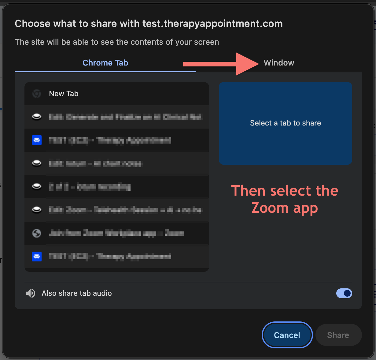 - Enable the 'Share audio' option at the bottom before clicking Share